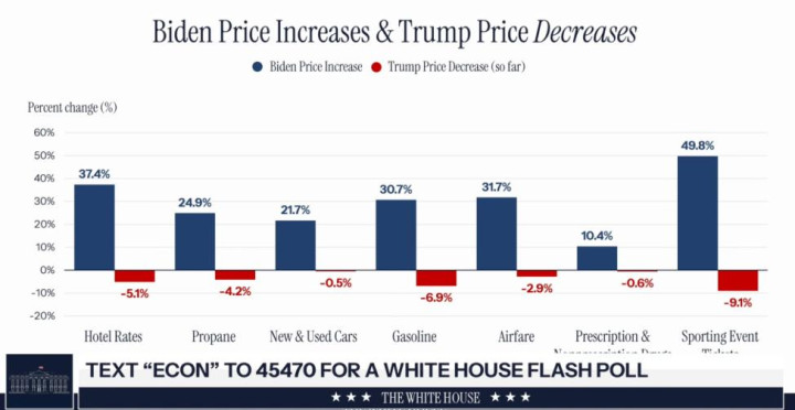 在讲话过程中,特朗普团队展示了一张数据图表,用以说明其执政期间的物价变化和工资走势。特朗普指出:“让我们看看事实。在拜登政府时期,汽车价格上涨了22%,在许多州甚至上涨了30%以上。”