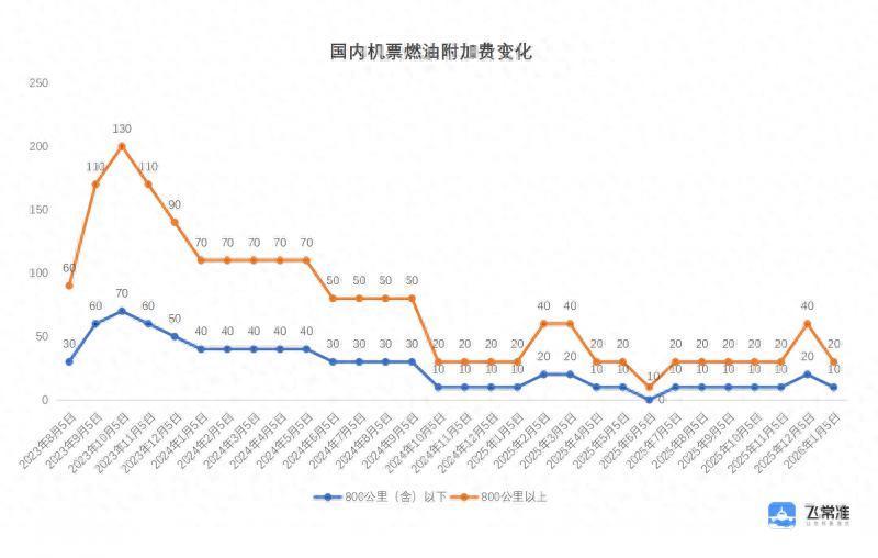 自2026年1月5日0时(出票日期)起,国内航线旅客燃油附加费下调,800公里(含)以下航段向每位成人旅客收取燃油费10元九龙证券,800公里以上航段向每位成人旅客收取燃油费20元,分别下调10元和20元。